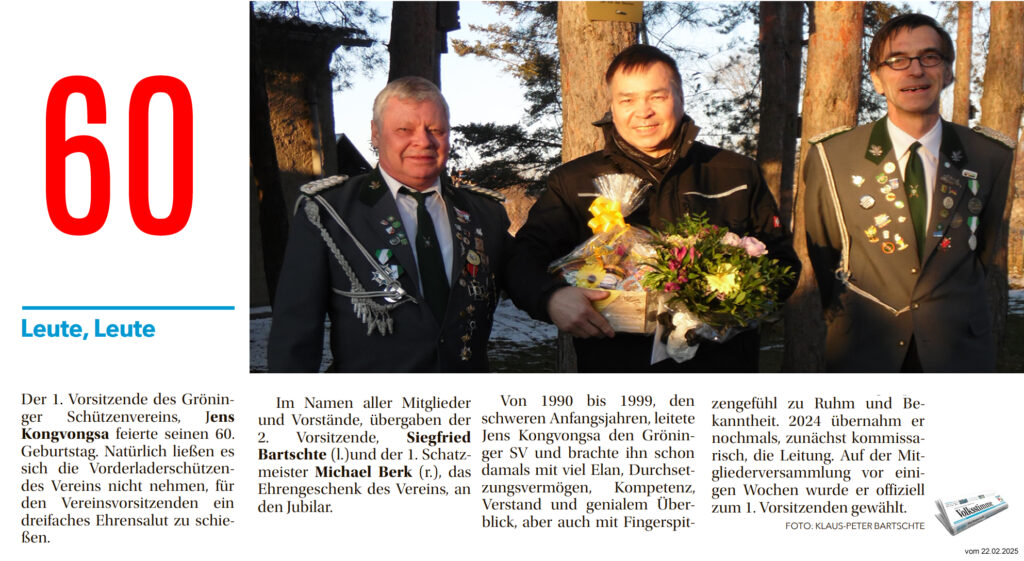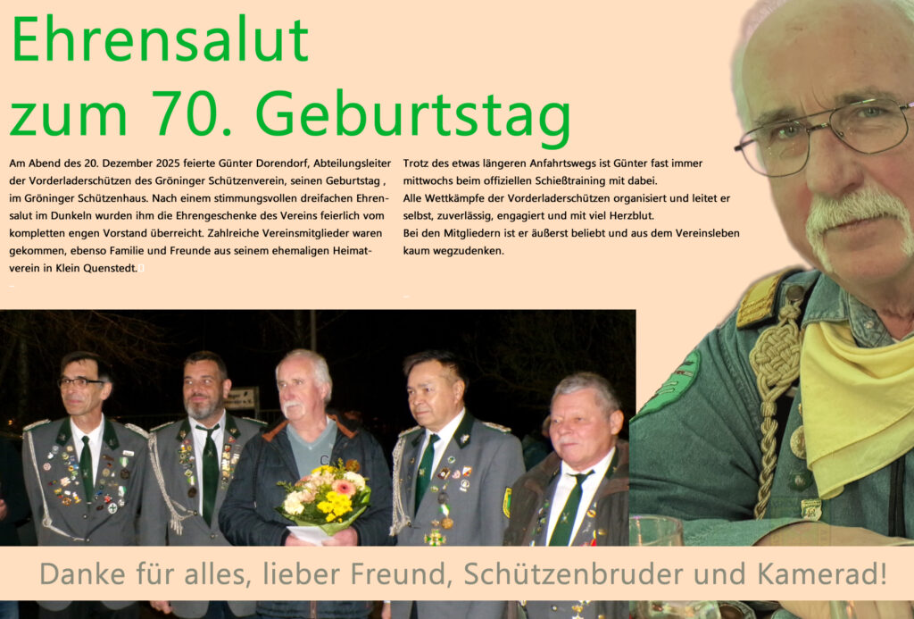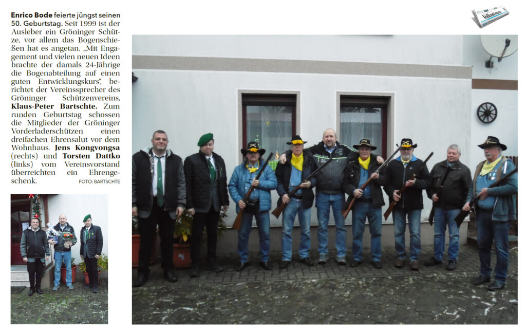 Am 30. April 2022 feierte Michael Berk, 1. Schatzmeister des GSV, seinen 50. Geburtstag im Gröninger Schützenhaus. Nach einem 3 fachen Ehrensalut der Vorderladerschützen aus Gröningen und Halberstadt übergaben der 1. Vorsitzende des GSV, Michael Grada und Mike Dube das Ehrengeschenk der Vereinsmitglieder. Für das leibliche Wohl sorgte die Gulaschkanone aus Wanzleben „Emil´s heißer Ofen“ mit Ihrem Team. Einer der „Renner“ war wohl die leckere Erbsensuppe mit Bockwurst.