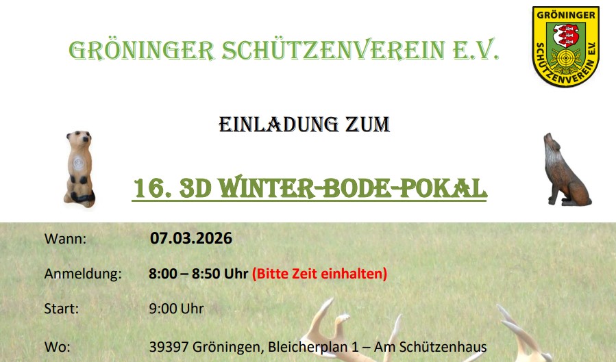 Der Gröninger SV, Abteilung Bogen läd alle Bogenschützen zum 14. Winterschießen 3D in die Bodestadt Gröningen ein. Der 3D Bogenparcour besteht in diesem Jahr aus 24+3 Ziele. Anmeldeschluß ist der 18.02.2024.