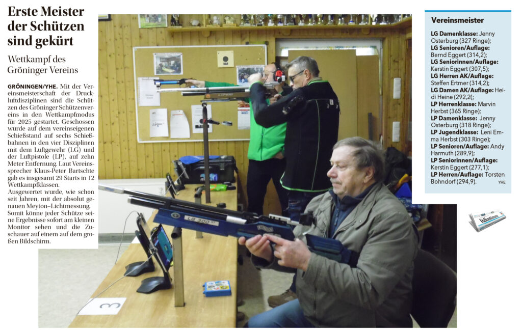 Am 27.12.2025 fand unser beliebtes Nachweihnachtsschießen statt. Mitglieder und Gäste des Gröninger Schützenvereins lieferten sich mit Luftdruckgewehren einen spannenden Wettkampf um die höchste Ringzahl. Geschossen wurden 10 Schuss auf elektronische Ziele in 10 Metern Entfernung.